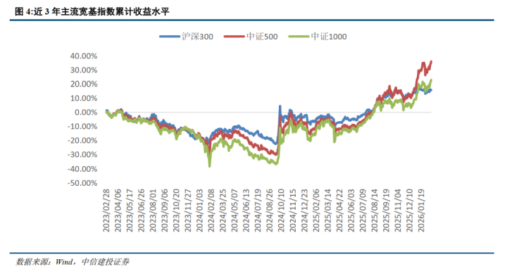 近3年来,三大主流宽基指数先跌后涨,摈弃到2026年2月,沪深300、中证500、中证1000的往日3年累计收益均为碰巧,辞别为16.49%、37.28%和24.17%,近1年收益辞别为18.71%、41.61%和31.71%。这意味着,这代表着在行情完成设立,慢慢酿成慢牛趋势并不休创出频年新高的情况下,商场参与者享受到了商场高涨所带来的beta收益,具有抓续参与商场的意愿与能源。同期,沪深300、中证500和中证1000近1年平均日均成交额为4463亿元、3272亿元、以及3953亿元,辞别对应的近3年日均成交额辞别为3175亿元,2154亿元和2708亿元,提高幅度均跳跃40%,相通印证了投资者的商场参与度显赫提高。从逾额角度,2025年主动权柄基金收益约30%,逾额中位数跳跃10%,体现出慢牛行情下主动权柄基金不错更好的匡助投资者捕捉高涨机遇,阐扬主动经管价值。