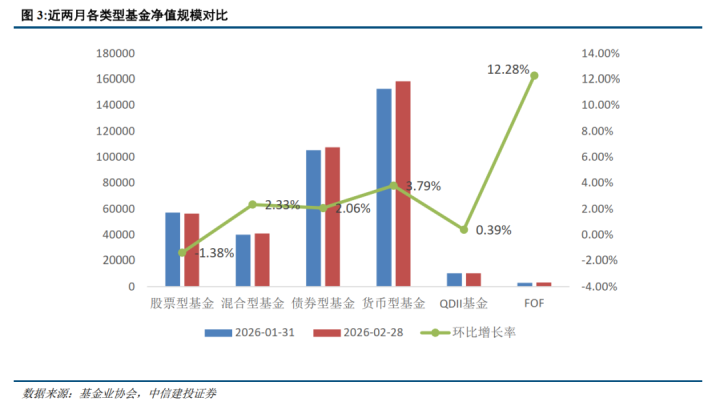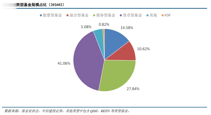 从类型结构上看,摈弃2026年2月,货币型居品仍然占据了商场中跳跃40%比例,债券型居品、股票型居品紧随后来,占比辞别为27.84%和14.58%,夹杂型基金、其他型基金(包括QDII基金、REITS等类型基金)和FOF基金等占比较小。